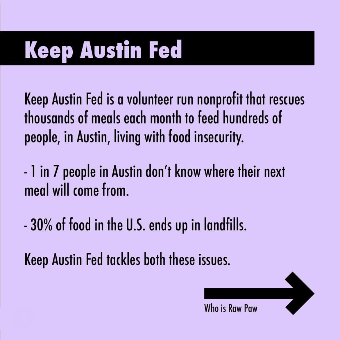 In an effort to promote a local Austin business and raise money for an NGO, I designed a tshirt and launched a social media campaign. The tshirts sold contributed to helping Raw Paw print shop keep their operations running during the height of the pandemic in 2020 and 100% of the profits were donated to Keep Austin Fed, a volunteer run non profit that distributes meals to people in need. ​​​​​​​